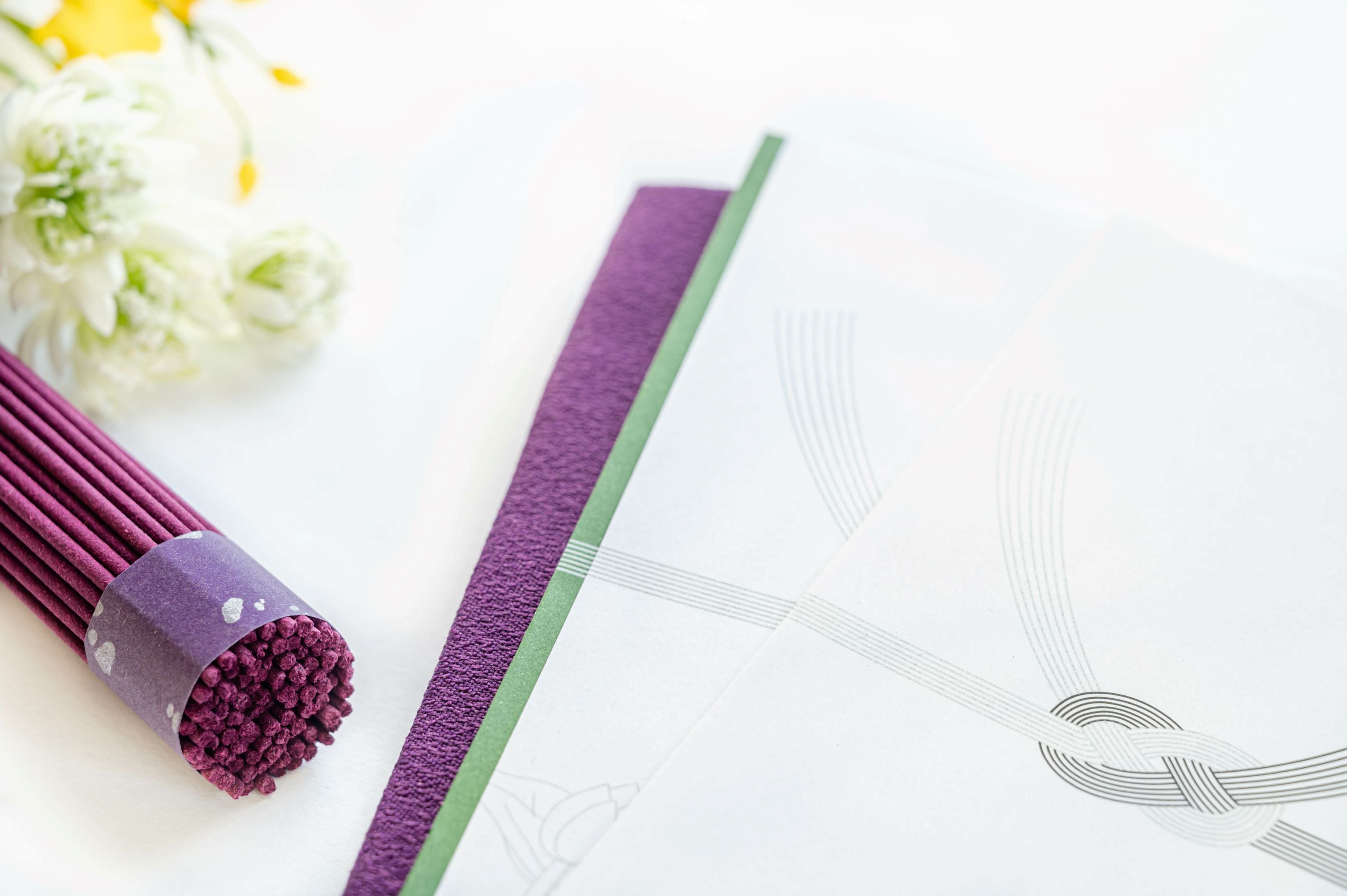 香典返しのタイミングは、逝去から50日目の五十日祭以降。表書きは「志」「偲び草」などとし、のしの印刷はなく、黒白、黄白結びきりの水引が印刷されたかけ紙(地域によって異なる)を使います。