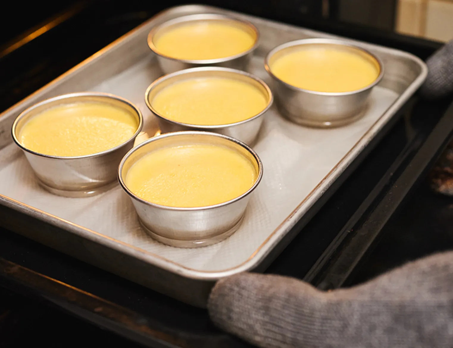 ⑤バットに湯をはり、キッチンペーパーを敷き、型をおく。 160度のオーブンで40分焼く。 そのまま湯が冷めるまでおき、粗熱がとれたら冷蔵庫で冷ます。