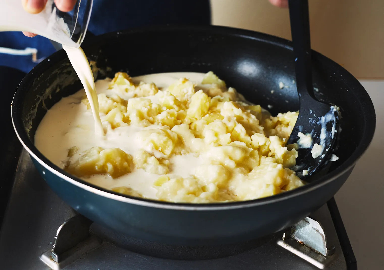 夏井 ホワイトソースは、かなりシンプルな作り方にしています。バターで炒めた玉ねぎに小麦粉を加え、そこに牛乳を少しずつ入れていく方法なので、失敗しにくいと思います。あとは、じゃがいもを牛乳で煮る工程ですね。ここで全体のまとまりがぐっと良くなります。