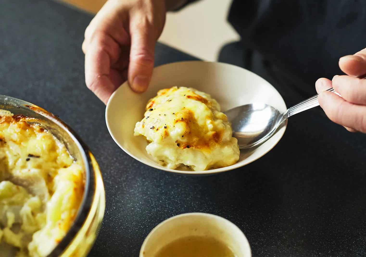 夏井 じゃがいもは味が強すぎず、ホクホクしていてとろみのある野菜ですよね。今回は最初にじゃがいもを牛乳で煮て、乳製品の風味を含ませています。じゃがいも自体にとろみがあるので、ホワイトソースの一部の役割も担ってくれるんです。グラタンには定番の食材ですが、やっぱり相性は抜群ですね。