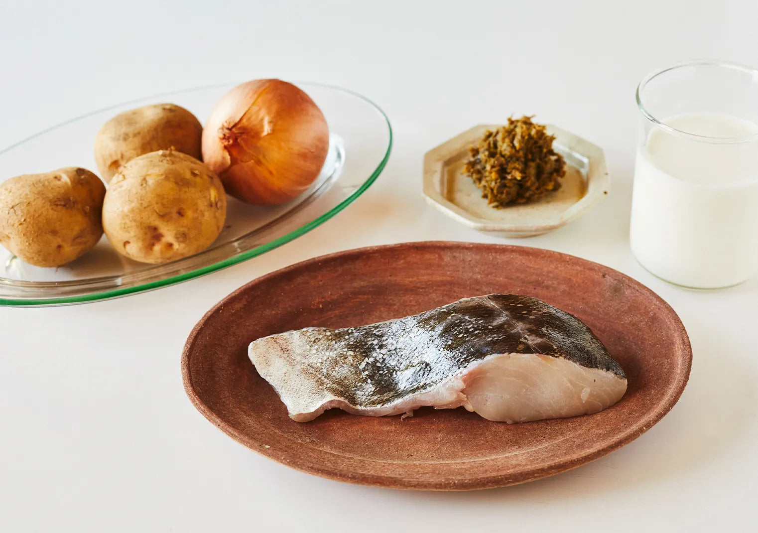 ①じゃがいもは皮を剥き5mmのいちょう切りにする。玉ねぎはみじん切りにする。鱈は皮を剥き3〜4等分に切り塩胡椒をして出てきた水分をふく。牛乳は温めておく。