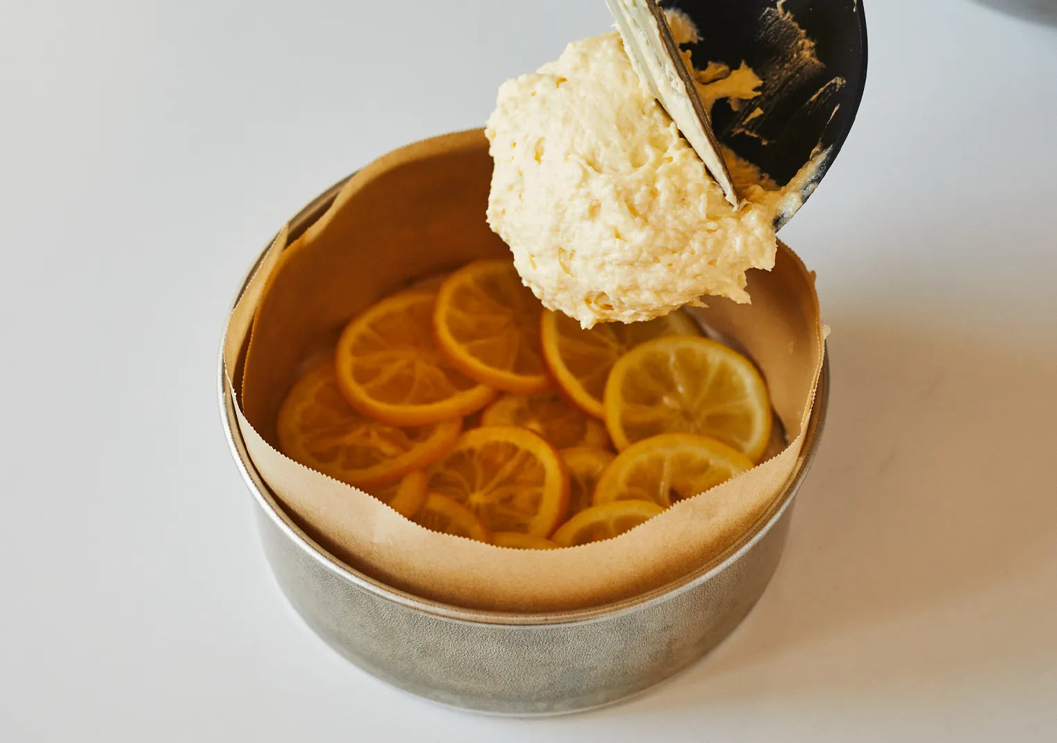 ②型にオーブンシートを敷き底に1のレモンを並べる。