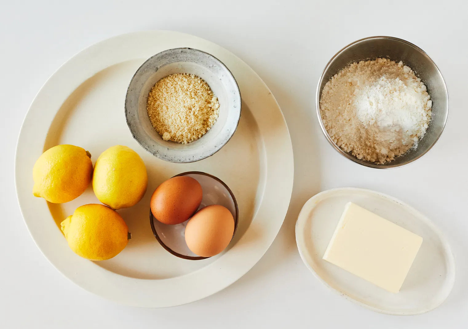 バターは薄切りにして大きめのボウルに入れ、室温においてやわらかくしておく。オーブンは170℃に予熱する。卵は小さめのボウルに割り入れ、よく溶きほぐしておく。