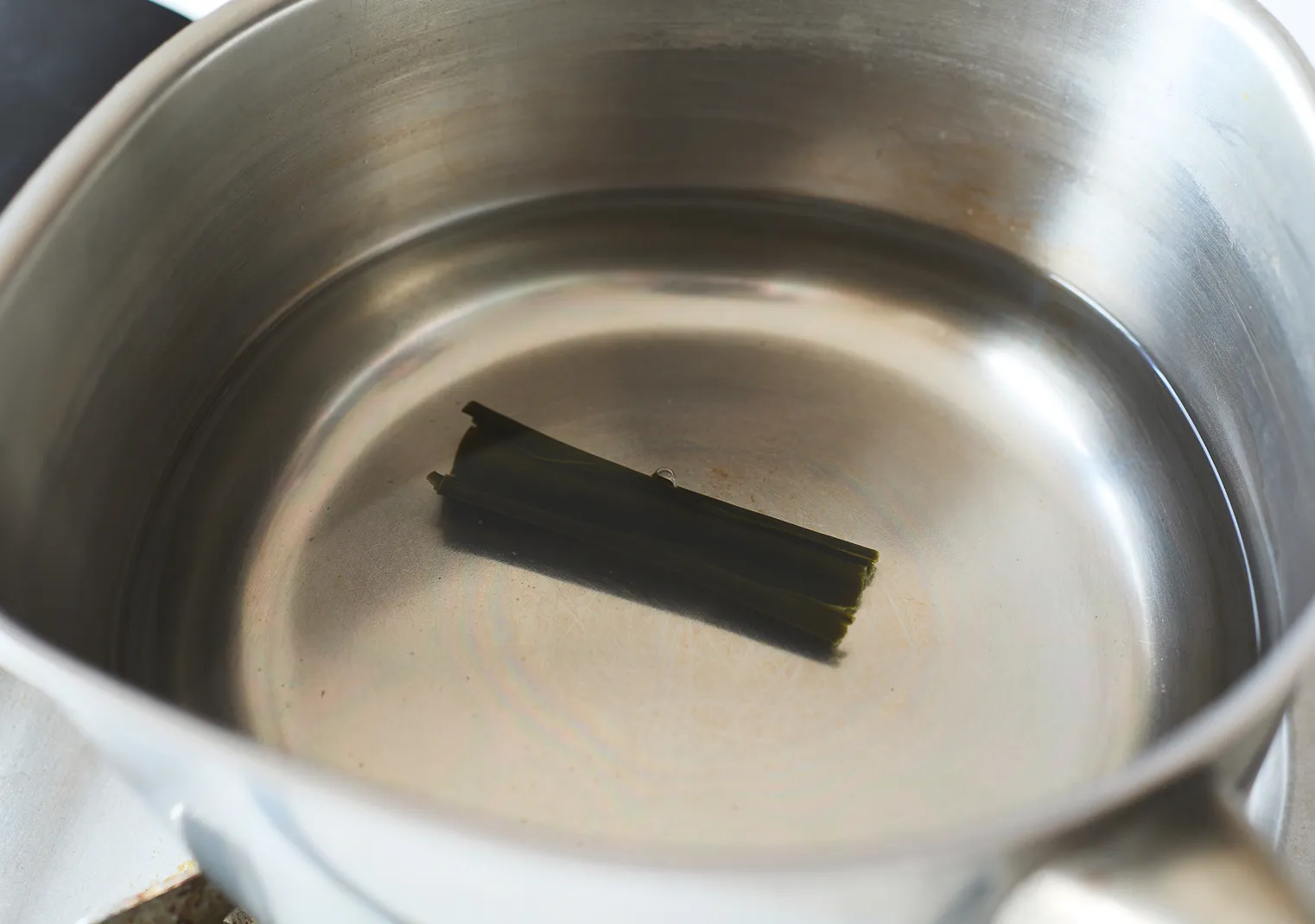 ③鍋に昆布と水を入れ30分程置く。火にかけ沸騰直前になったら火を止め10分置く。昆布を取り出す。