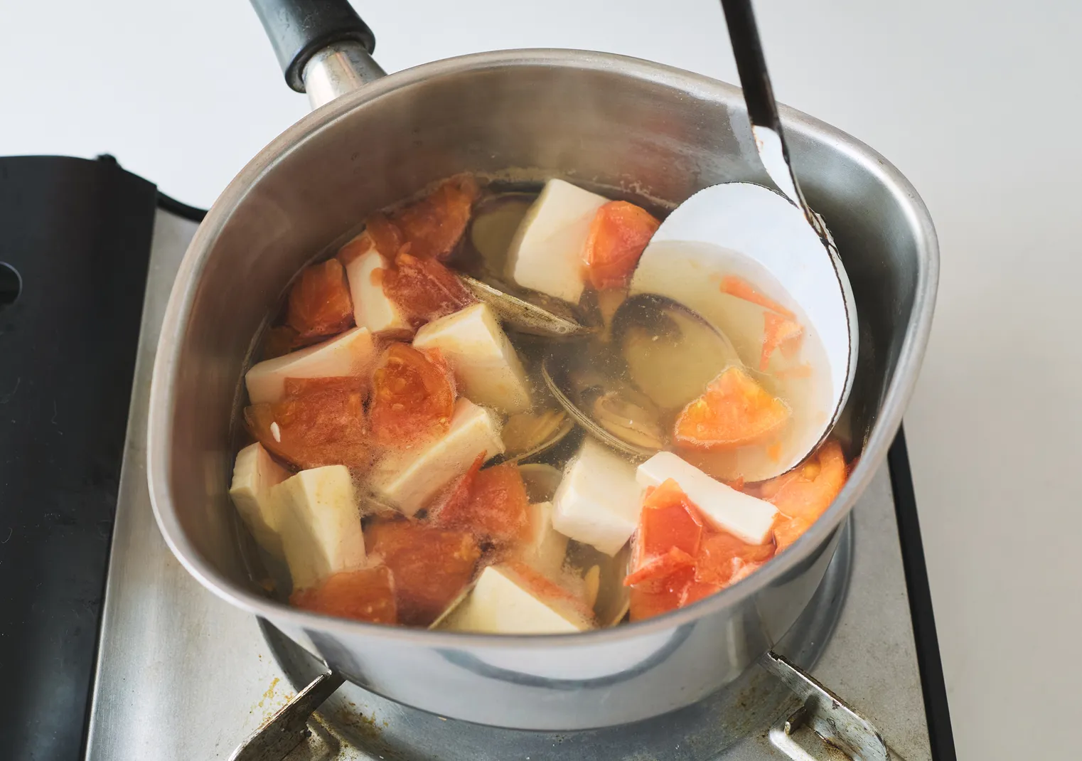 ④あさりを入れ再び火にかける。あさりが開いたらトマトと豆腐を入れ中弱火で5分煮る。塩と醤油で味を調える。器に盛り細ねぎを散らす。
