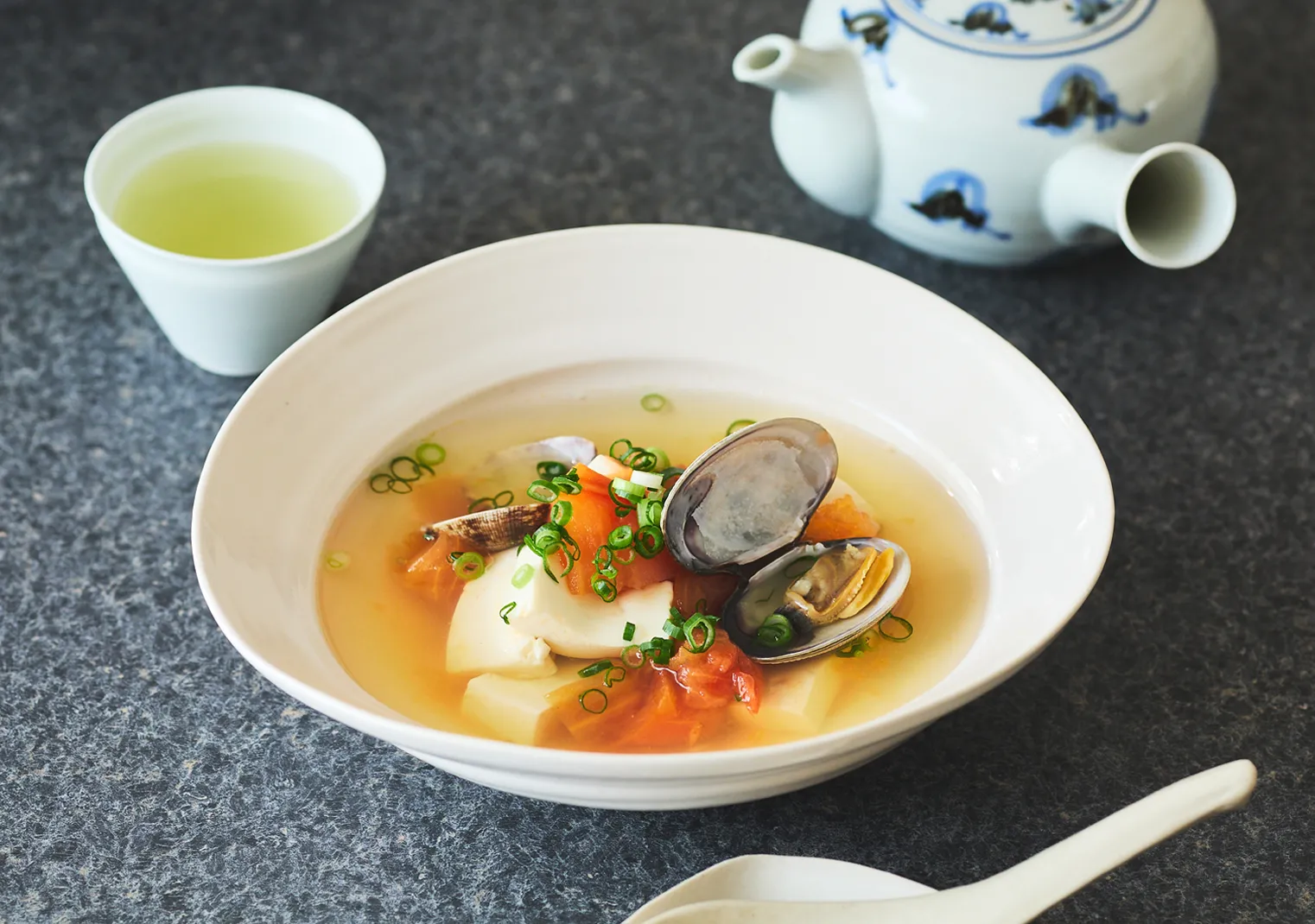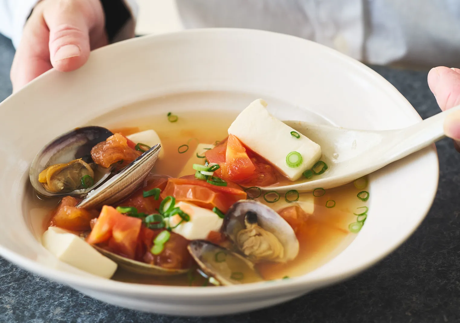 春が旬のあさりに、豆腐とトマトを添えた軽やかなスープ。