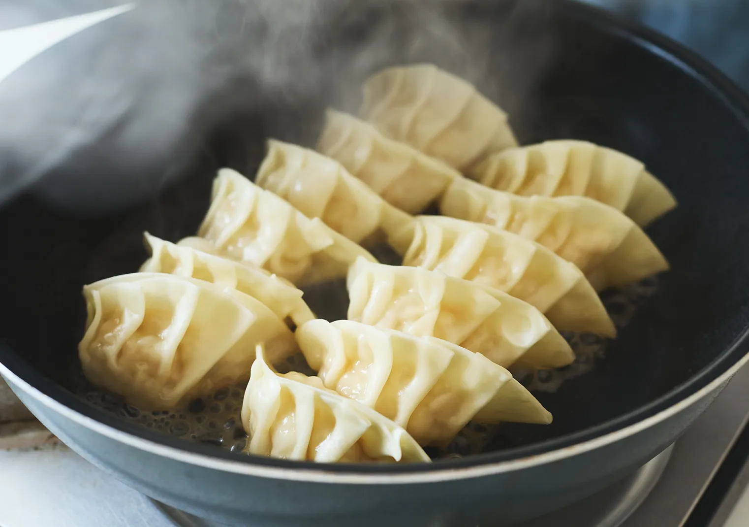 ③フライパンにサラダ油適量(分量外)を敷き餃子を並べて焼く。(10〜13個)焼き色がついたら水100ccを入れ蓋をして5分蒸焼きにする。蓋をとり水分が残っていたらとばす。