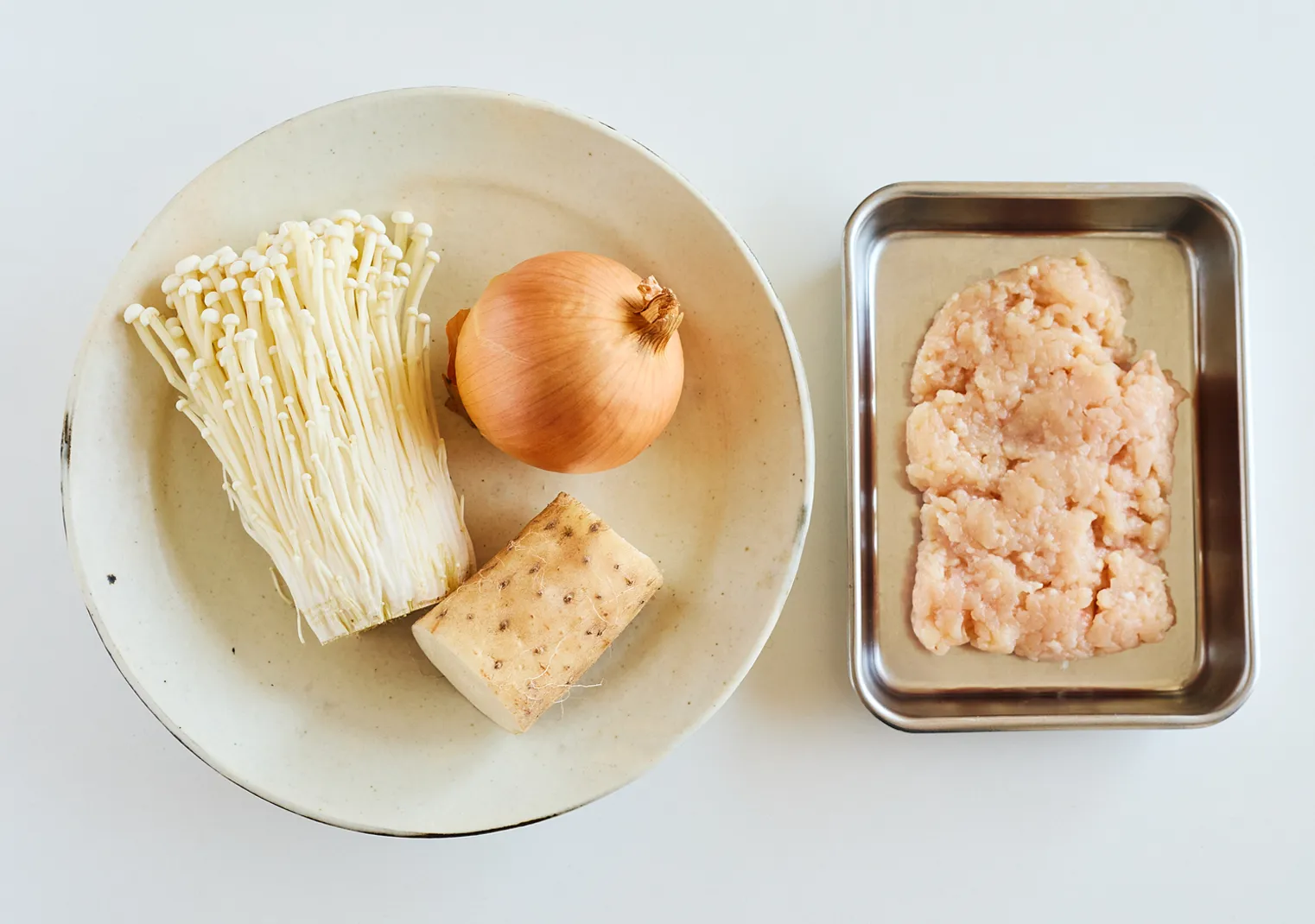 夏井 むね肉はどうしてもパサつくイメージがありますよね。そこを、粘りのある山芋と、水分を多く含むえのきで補っています。えのきは細かく刻むと、とろみが出るんです。その粘りで、むね肉の水分が逃げにくくなるイメージですね。