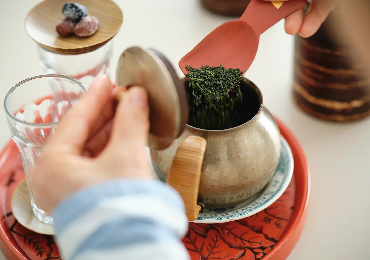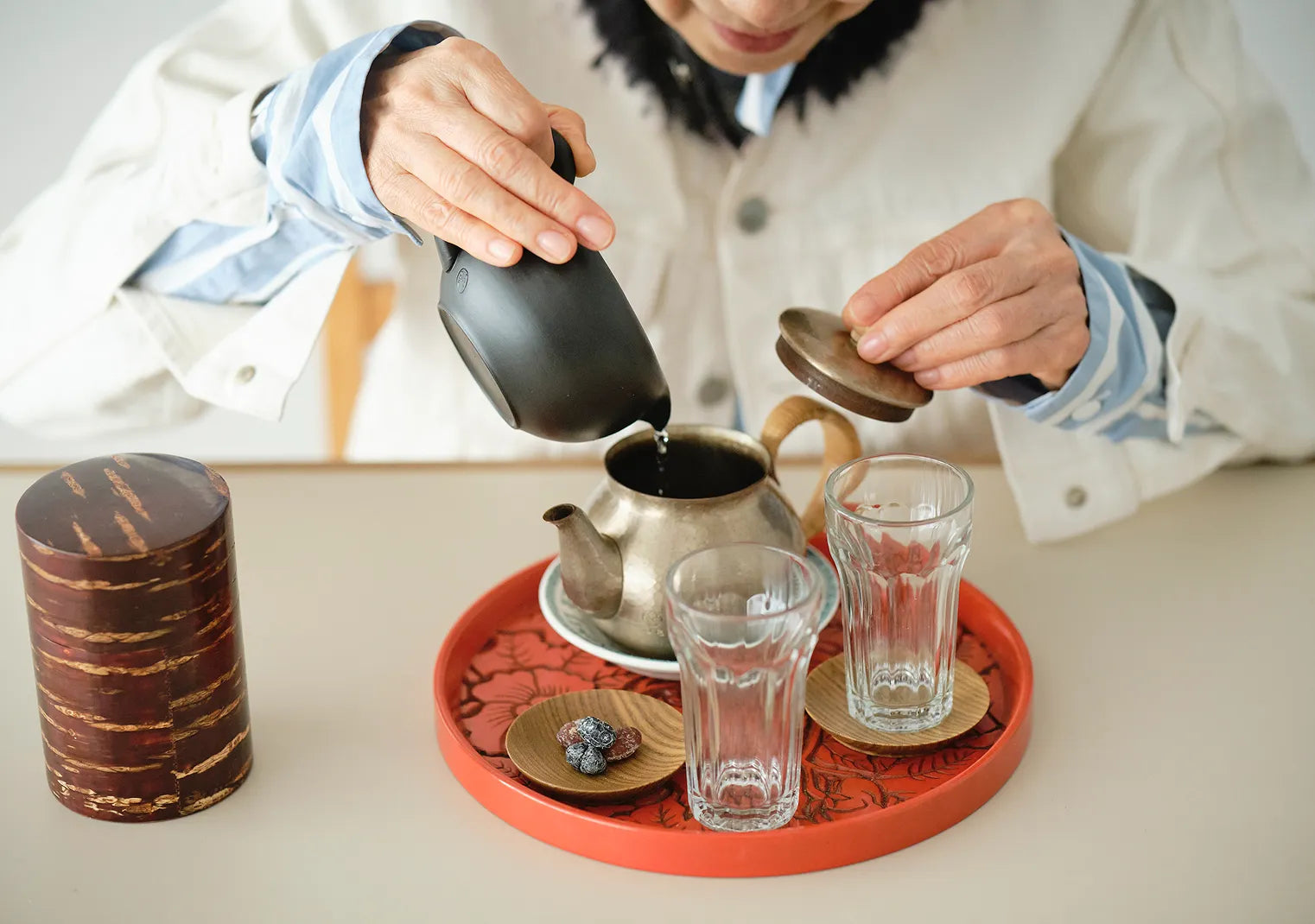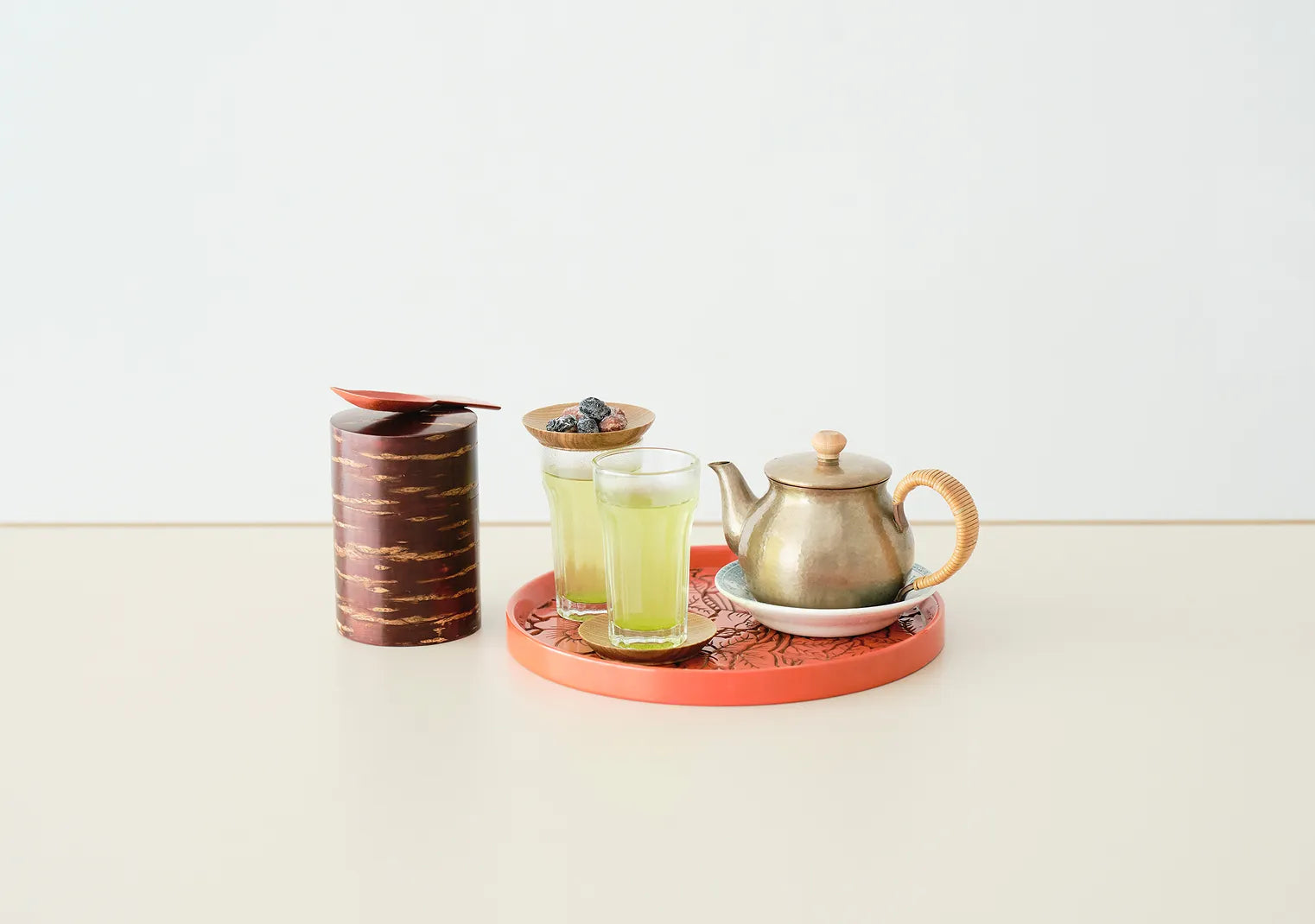 お母様の手作りという鎌倉彫のお盆。「玉川堂」と料理家・有元葉子さんとのコラボレーションによる美しい板金の急須が乗っているのは、フランス在住の友人がお土産にくれたというSchweppesと印字されたアンティークの小皿。桜皮の茶筒と漆塗りの匙は、気づいた頃には家にあったという“落ち着く”道具たち。