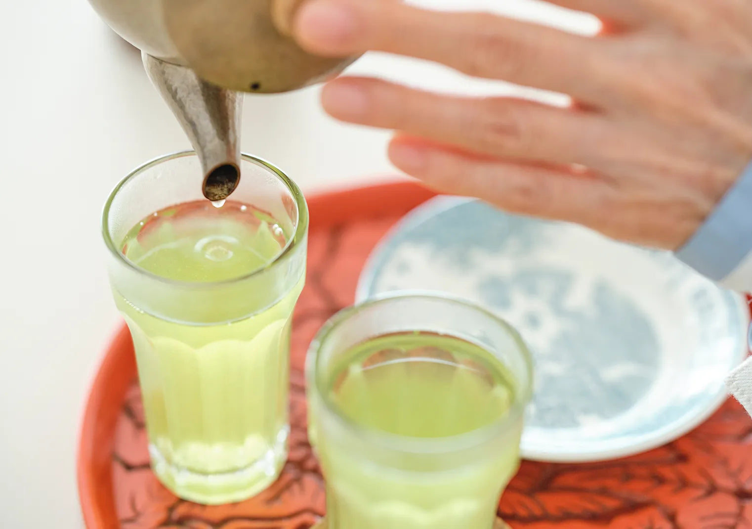 「朝の飲み物として、この黄緑色のお茶が一番。なにより色が綺麗でしょ。家で飲むお茶は温かいものと決まっていますね。土瓶でお湯を沸かして、湯気が出てきたらまずはお白湯を飲んで、お茶を入れながらお支度をして、お茶うけの甘納豆などをつまんで、ささっと家を出ちゃう。これはもう毎朝のルーティンと言っても過言ではないくらい」