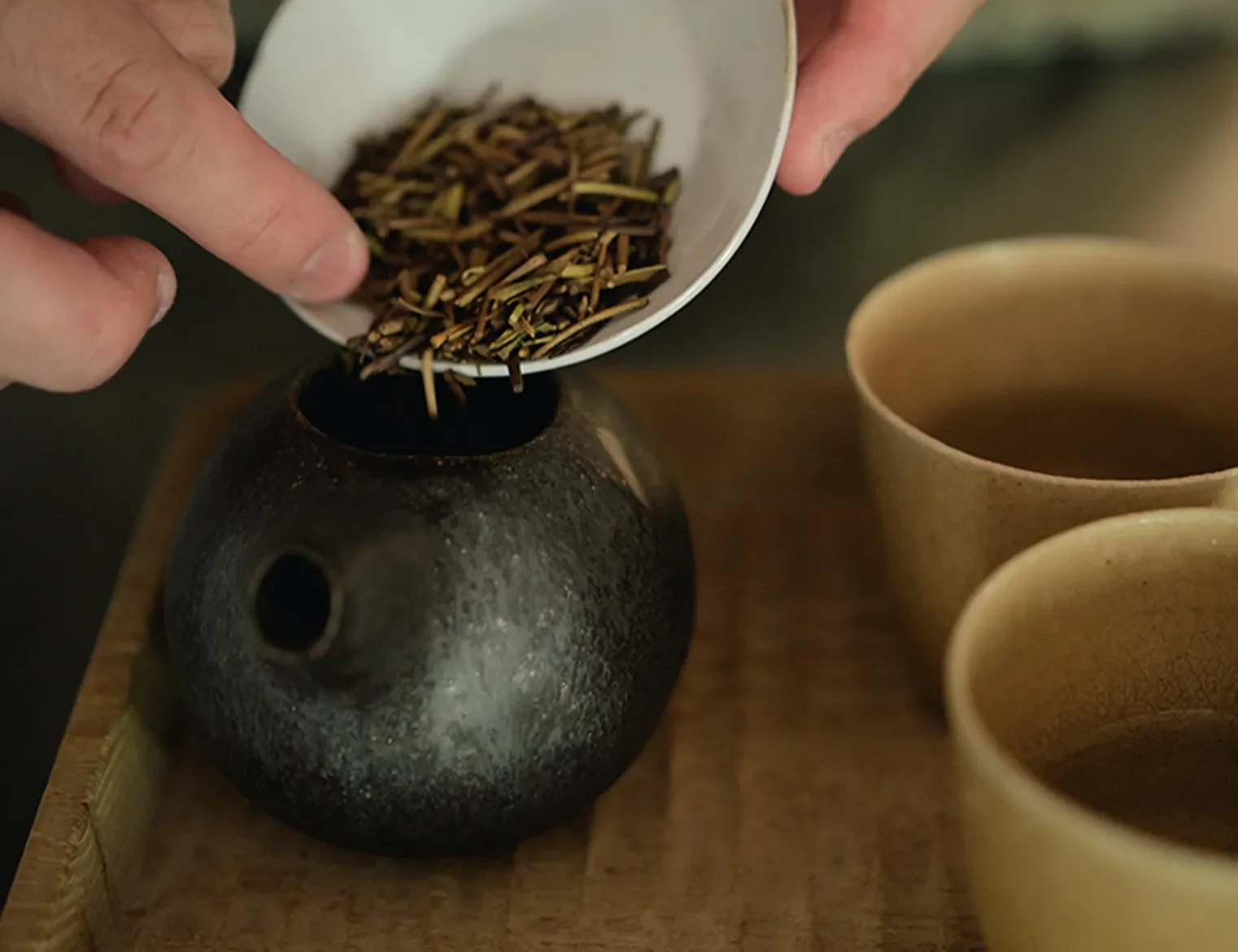 「よく飲むのは、ほうじ茶、玄米茶、番茶などですね。飲みやすく、香ばしい風味が好きなんです。使う茶道具は、淹れるお茶や人数に応じて選びます。二人分なら、小さめの急須で。料理教室の時など大人数で楽しむ時はシルバーのポットでたっぷり淹れたり。今日使っているのは、福岡県で作陶をしている岩田圭介さんの急須です。ピタッと湯切れが素晴らしく良く、気に入っています」