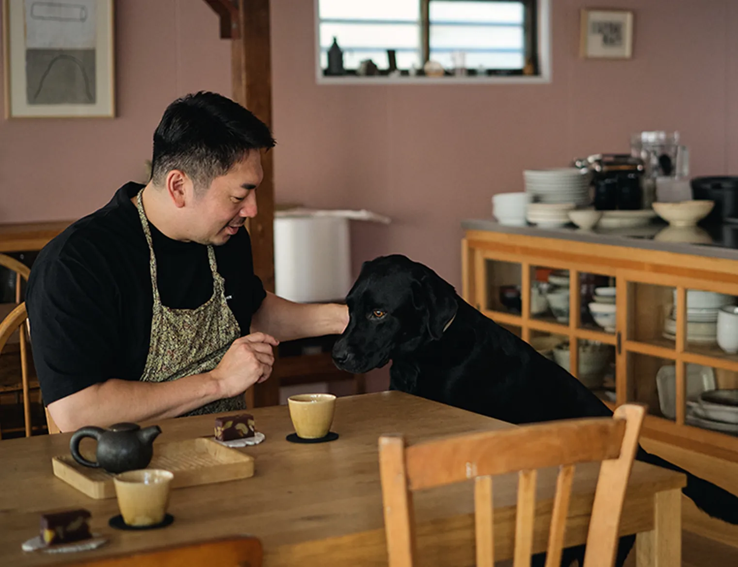 料理教室を主宰しながら、食材と調理道具のお店〈Cibo e Gino〉を営む料理家の渡辺康啓さん。2024年2月に東京・曙橋にオープンしたお店は、元製本所だったという木造の建物を改装し、広々としたオープンキッチンを中心にした明るく開放的なつくりだ。朝は自宅で定番のミルクティーを飲み、愛犬のジーノくんと共に出勤。