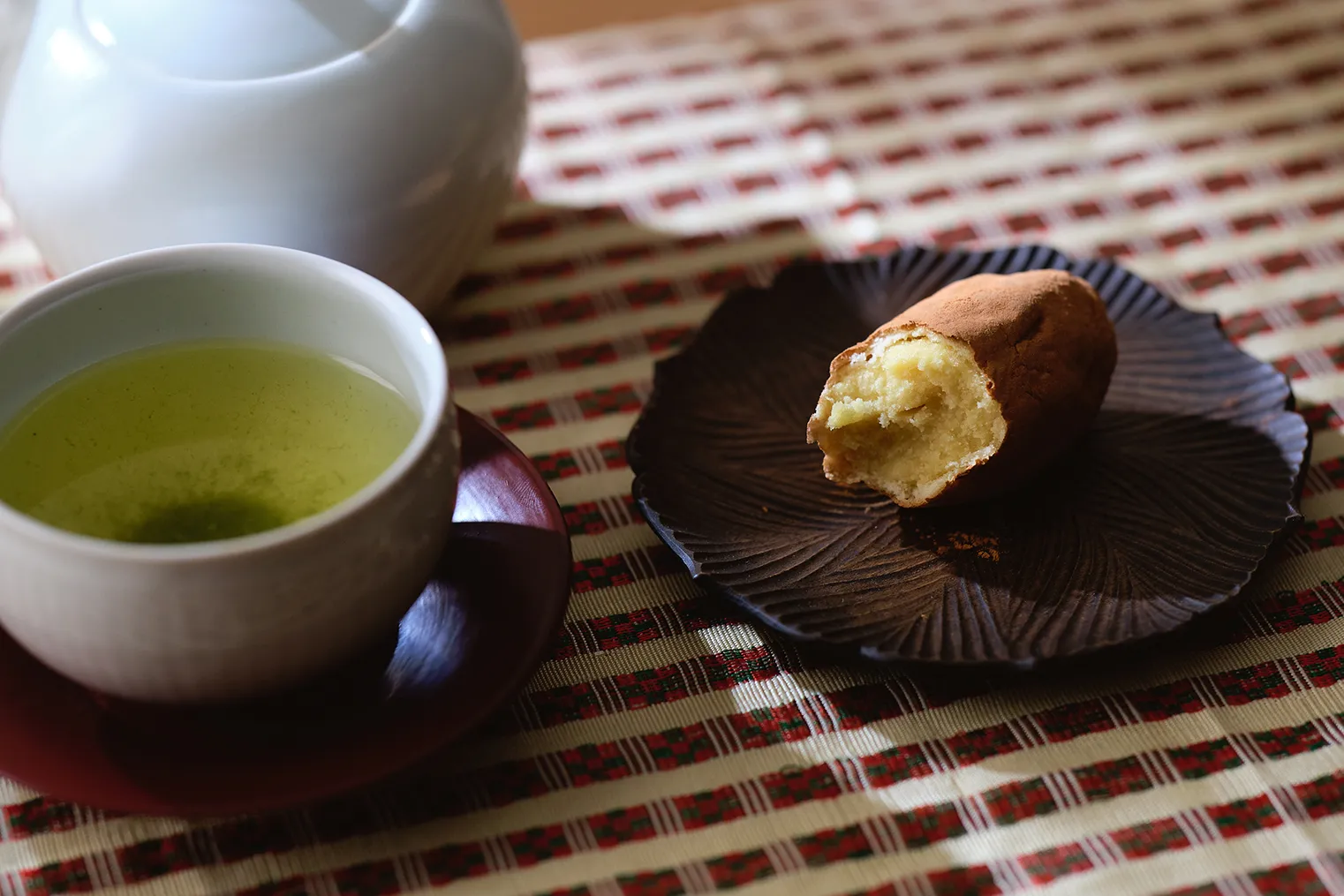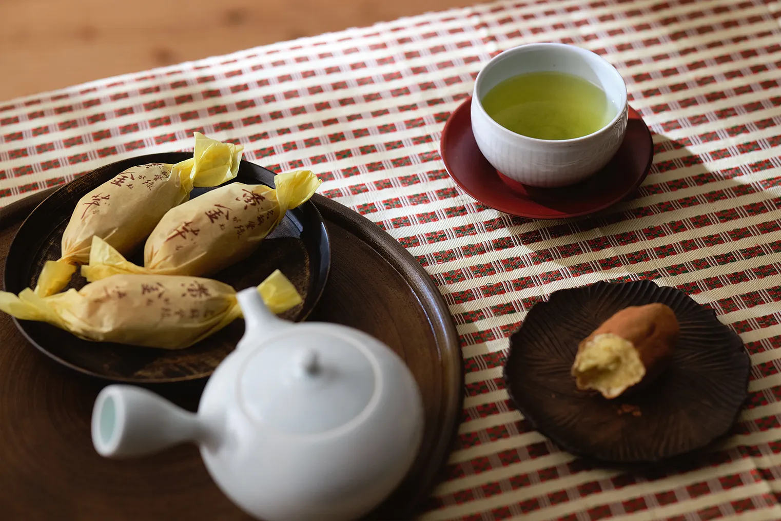 清涼感溢れるニッキの風味が口の中いっぱいに広がったかと思えば、薄皮がほろほろと崩れ、黄身餡のしっとりとした甘味とニッキの刺激が絶妙なバランスで絡み合います。黄金芋を舌の上でゆっくりと味わい尽くしたら、程よい渋みの合組煎茶を一口。煎茶の香りと渋みで口の中がさらりと濯がれると、ニッキの余韻が再び鼻腔をかすめ、さらにもう一口、もう一本と手が伸びます。