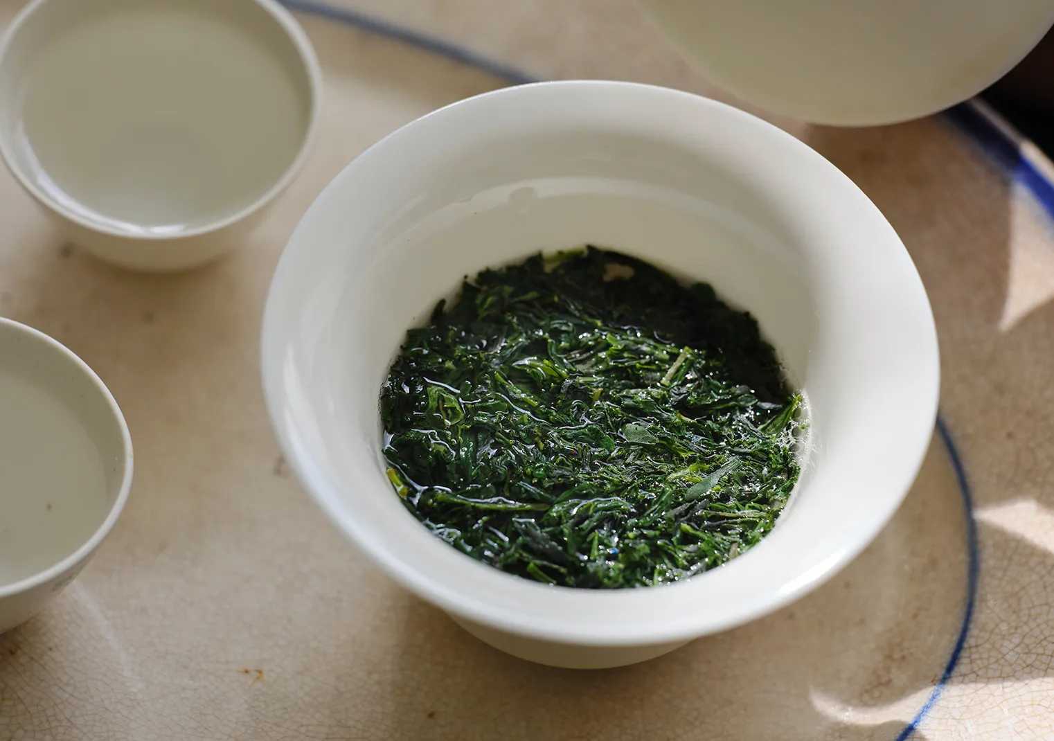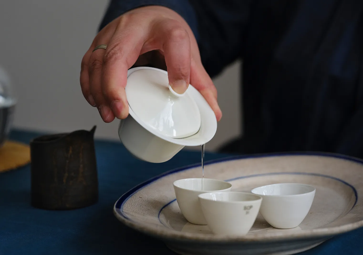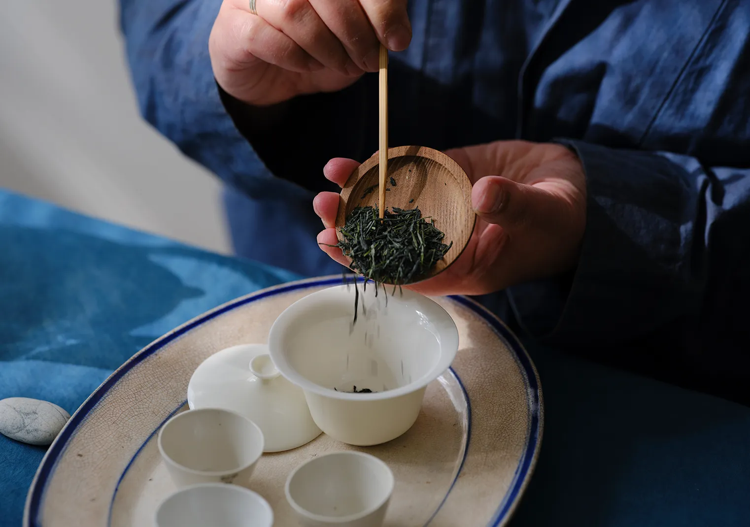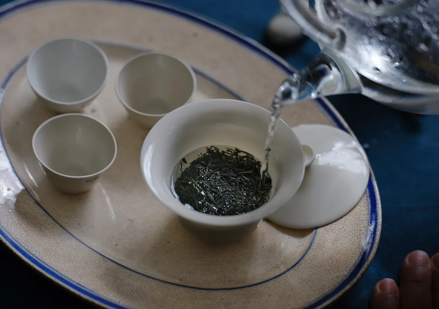 「なかでも玉露は低めの温度で淹れるので、蓋碗で淹れるお茶として理にかなう」とも。蓋をしてゆっくり蒸らした後は、すっと蓋をずらして注ぎます。茶器の縁から糸のように垂れる玉露は、まさに春雨を彷彿とさせるような繊細さです。最後の一滴まで玉露を注ぎきり蓋を開けると、濃厚な茶葉の香りがふわりと広がります。
